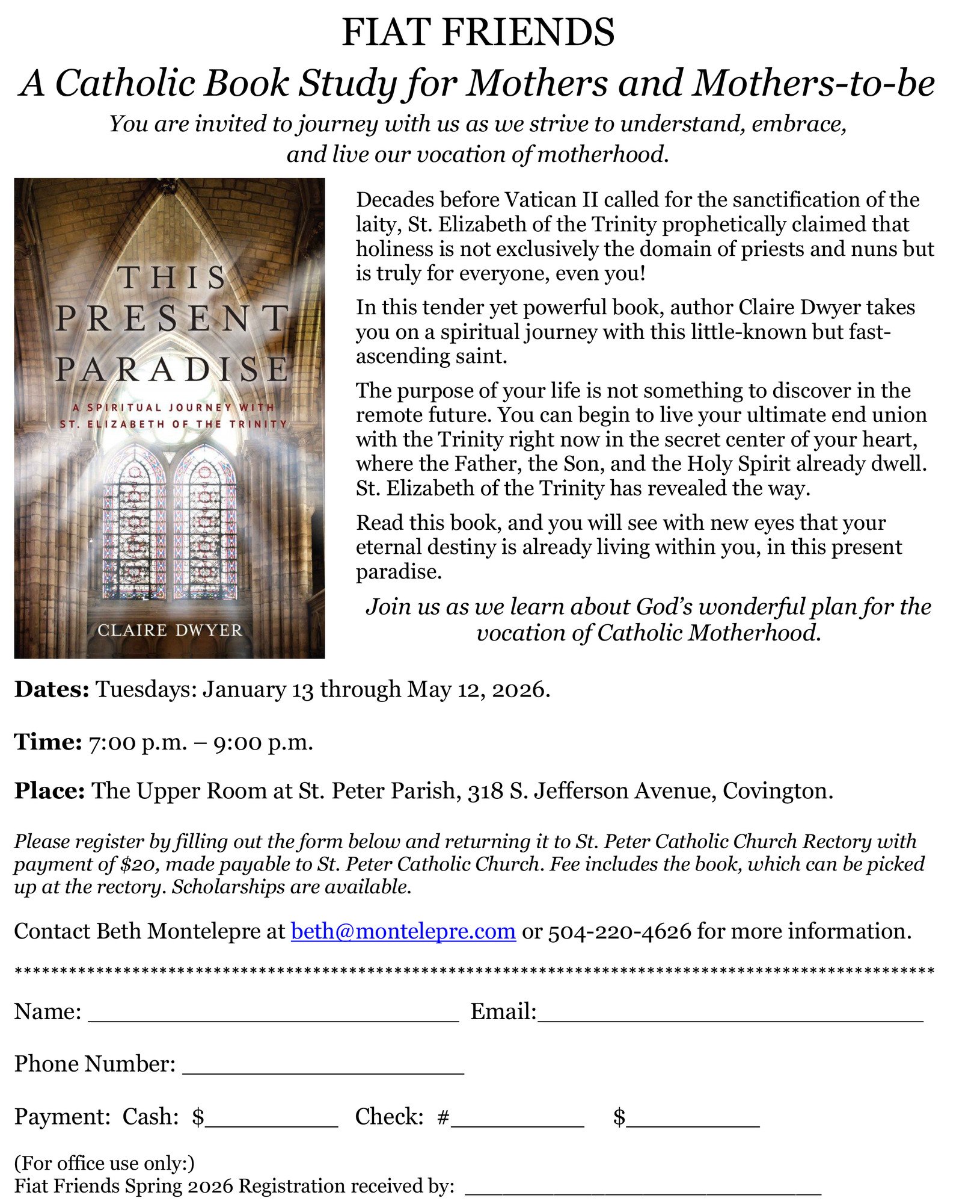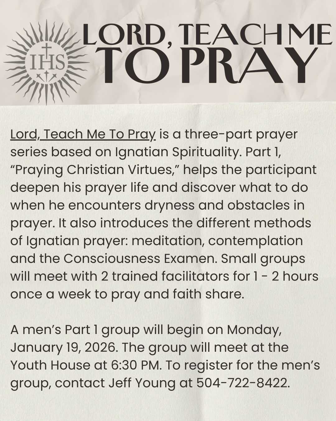 Please call the Parish Office at 985.892.2422 if you are interested in becoming a Committed Adorer. Certain hours are in urgent need of adorers or partners; more information can be found on the Eucharistic Adoration page HERE.