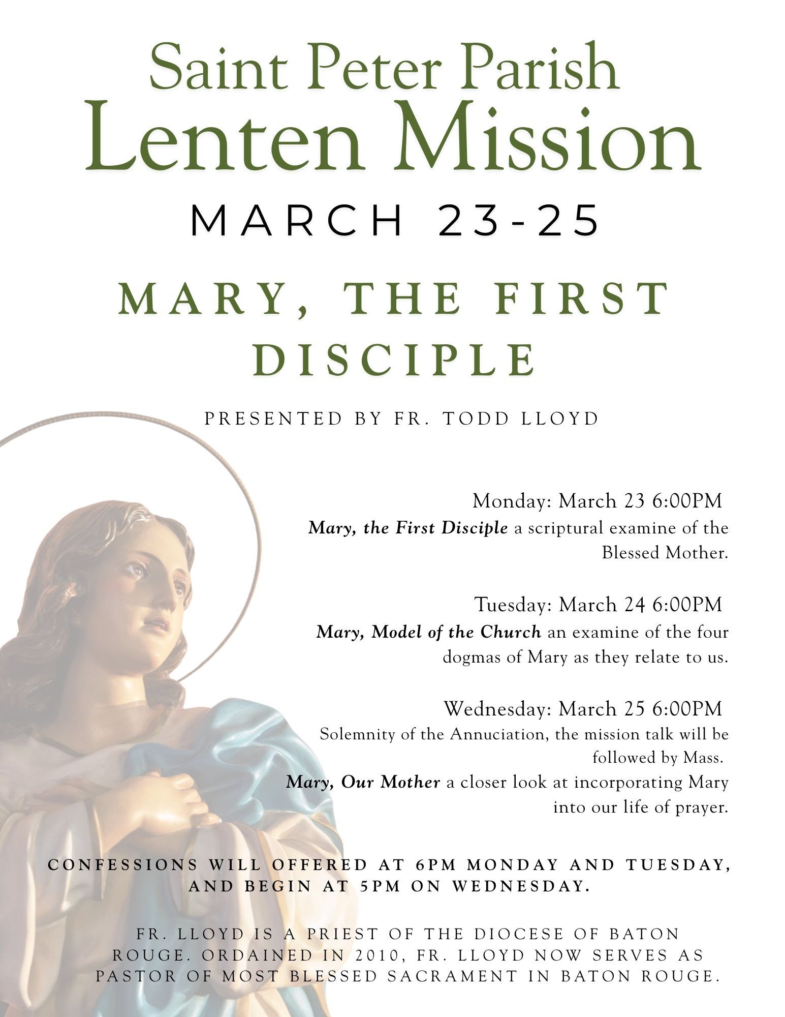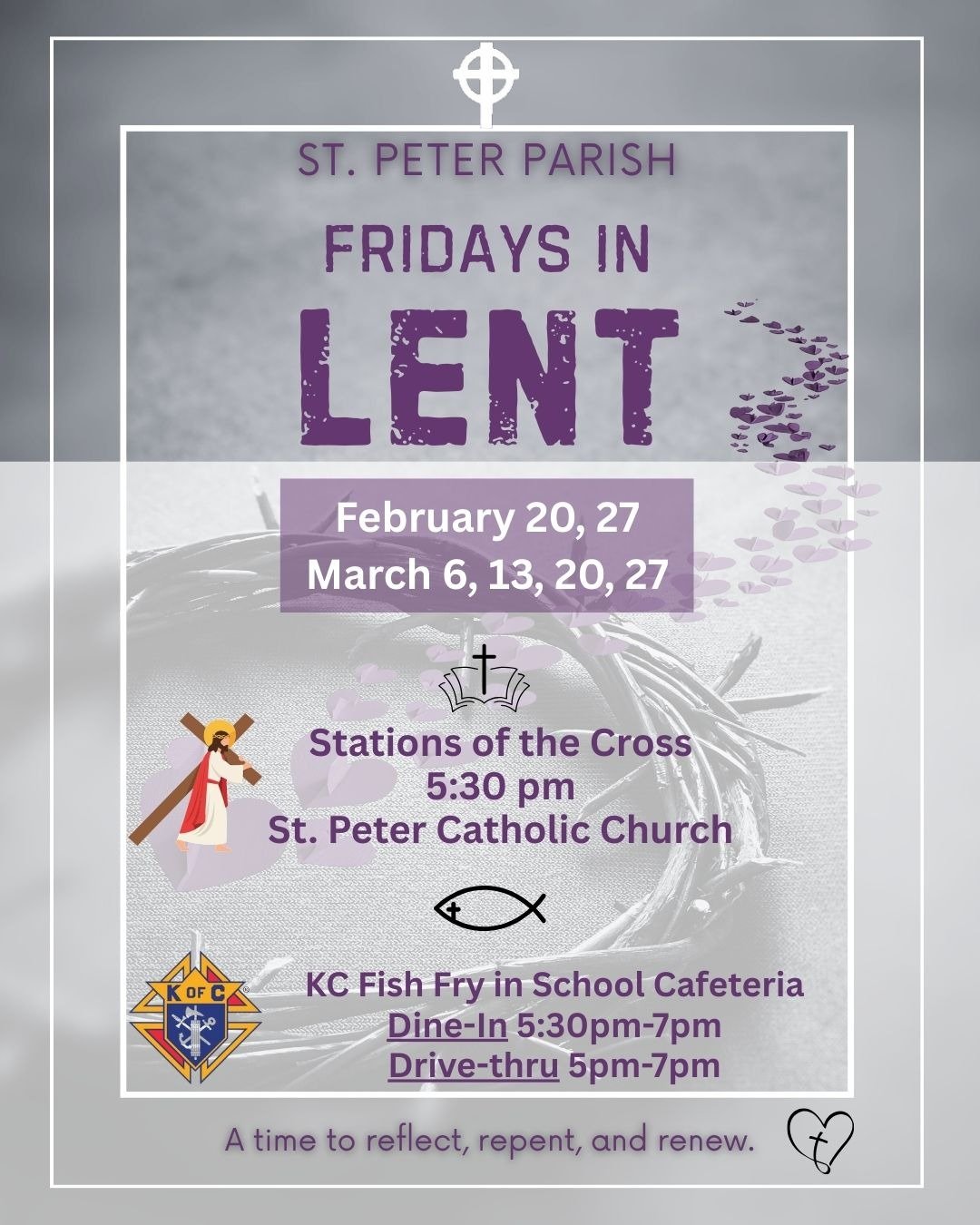 "Lent is a 40 day season of prayer, fasting, and almsgiving that begins on Ash Wednesday and ends at sundown on Holy Thursday. It's a period of preparation to celebrate the Lord's Resurrection at Easter. During Lent, we seek the Lord in prayer by reading Sacred Scripture; we serve by giving alms; and we practice self-control through fasting. We are called not only to abstain from luxuries during Lent, but to a true inner conversion of heart as we seek to follow Christ's will more faithfully. We recall the waters of baptism in which we were also baptized into Christ's death, died to sin and evil, and began new life in Christ."