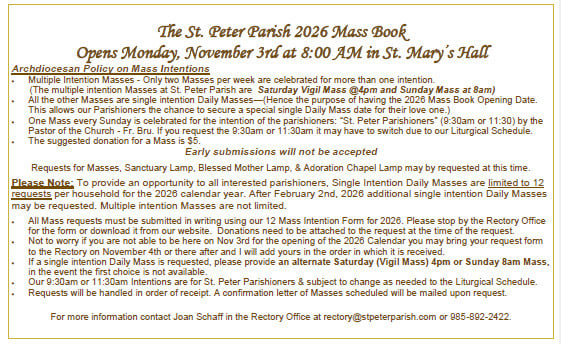 The Mass Intentions Book for the 2026 calendar year opens on Monday, November 3, 2025 at 8 am in St. Mary's Hall